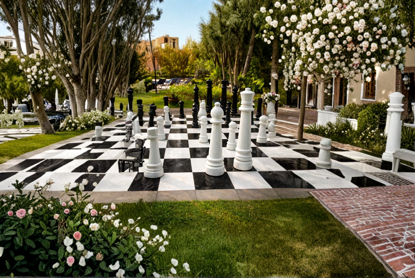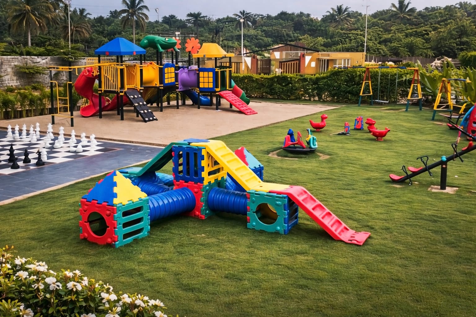 Adding a unique touch to the outdoor experience is the life-size human chess arena, beautifully set on the lawn for strategic fun and interactive group engagement. The surrounding green lawns also host playful installations like seesaws and balance equipment, offering delightful recreation for younger guests.